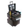 El maletín rodante está equipado con espacios diseñados para implementos de limpieza, asegurando que todo lo necesario esté al alcance de la mano. Su diseño práctico permite un acceso rápido y organizado a los suministros, optimizando el tiempo del personal de limpieza.